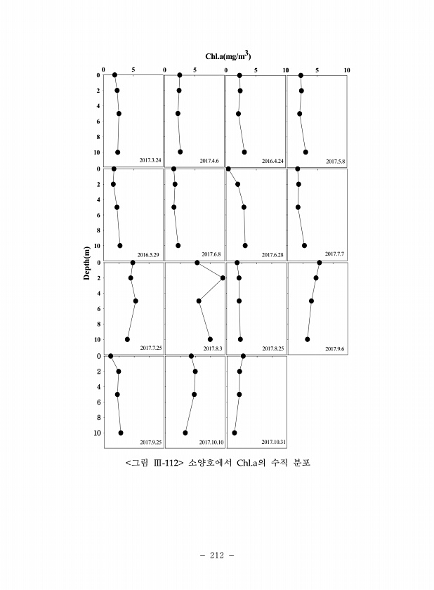 212 0 5 0 5 10 0 2 4 6 8 10 Chl.a mg/m3 0 5 0 5 10 Depth m 0 2 4 6 8 10 2017.3.24 2017.4.6 2016.4.24 2017.5.8 2016.5.29 2017.6.8 0 2 4 6 8 10 0 2 4 6 8 10 2017.6.28 2017.7.7 2017.7.25 2017.8.3 2017.8.25 2017.9.6 2017.9.25 2017.10.10 2017.10.31 그림 Ⅲ-112 소양호에서 Chl.a의 수직분포