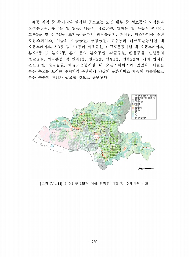 제공 지역 중 주거지와 밀접한 곳으로는 도심 내부 중 성포동의 노적봉과 노적봉공원, 부곡동 및 일동, 이동의 성호공원, 월피동 및 와동의 광덕산, 고잔1동 및 선부1동, 초지동 동부의 화랑유원지, 화정천, 와스타디움 주변 오픈스페이스, 이동의 이동공원, 구룡공원, 호수동의 대규모운동시설 내 오픈스페이스, 사3동 및 사1동의 석호공원, 대규모운동시설 내 오픈스페이스, 본오3동 및 본오2동, 본오1동의 본오공원, 각골공원, 반월공원, 반월동의 반달공원, 원곡본동 및 원곡1동, 원곡2동, 선부1동, 선부2동에 거쳐 입지한 관산공원, 원곡공원, 대규모운동시설 내 오픈스페이스가 있었다. 이들은 높은 수요를 보이는 주거지역 주변에서 양질의 문화서비스 제공이 가능하므로 높은 수준의 관리가 필요할 것으로 판단된다. [그림...
