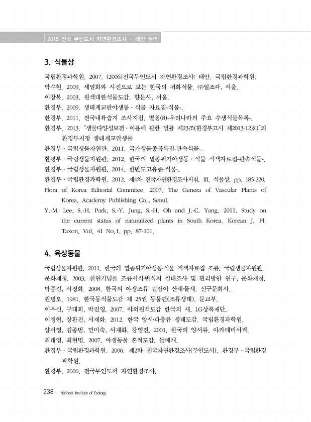 2015 전국 무인도서 자연환경조사 태안 권역 238 ? National Institute of Ecology 3. 식물상 국립환경과학원. 2007. 2006 전국무인도서 자연환경조사태안. 국립환경과학원. 박수현. 2009. 세밀화와 사진으로 보는 한국의 귀화식물. ㈜일조각, 서울. 이창복. 2003. 원색대한식물도감. 향문사, 서울. 환경부. 2009. 생태계교란야생동·식물 자료집-식물-. 환경부. 2011. 전국내륙습지 조사지침. 별첨 8 -우리나라의 주요 수생식물목록-. 환경부. 2013. “생물다양성보전·이용에 관한 벌률 제23조 환경부고시 제2013-12호 ”의 환경부지정 생태계교란생물 환경부·국립생물자원관. 2011. 국가생물종목록집-관속식물-. 환경부·국립생물자원관. 2012. 한국의 멸종위기야...