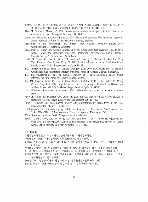 886 홍석영, 장용선, 김이현, 김명숙, 최은영, 하상건. 아시아 지역과 우리나라 토양탄소 저장량 추 정 연구 사례. 2010. 한국토양비료학회 학술발표회 초록집 10148-149. Alam M, Dupras J, Messier, C. 2016. A framework towards a composite indicator for urban ecosystem services. Ecological Indicators 6038-44. Center for Global Environmental Research. 2015. National Greenhouse Gas Inventory Report of Japan. National Institute for Environmental Studies, Tsukuba. Depa...