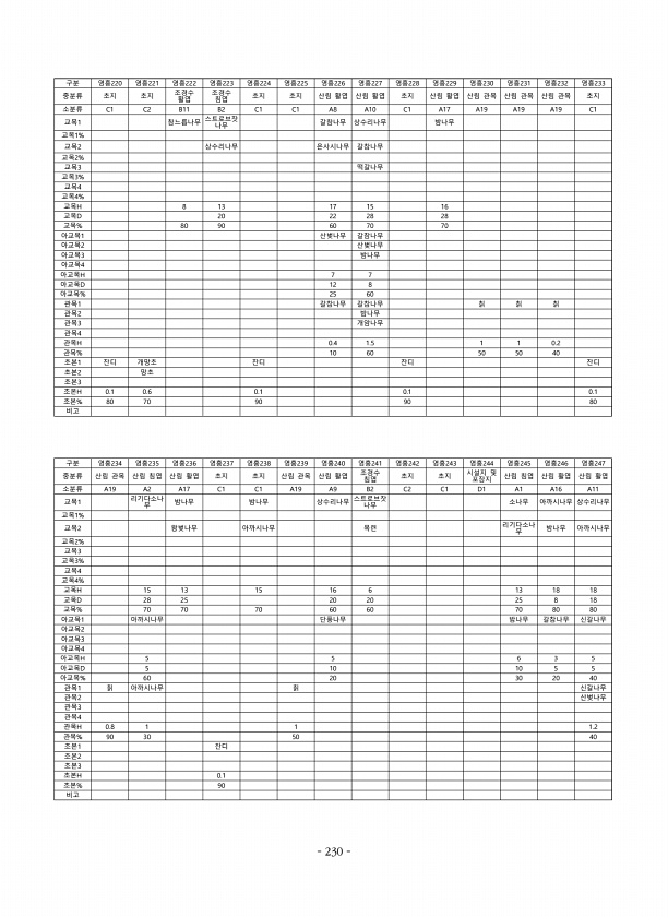 구분 영흥220 영흥221 영흥222 영흥223 영흥224 영흥225 영흥226 영흥227 영흥228 영흥229 영흥230 영흥231 영흥232 영흥233 중분류 초지 초지 조경수 활엽 조경수 침엽 초지 초지 산림 활엽 산림 활엽 초지 산림 활엽 산림 관목 산림 관목 산림 관목 초지 소분류 C1 C2 B11 B2 C1 C1 A8 A10 C1 A17 A19 A19 A19 C1 교목1 참느릅나무 스트로브잣 나무 갈참나무 상수리나무 밤나무 교목1% 교목2 상수리나무 은사시나무 갈참나무 교목2% 교목3 떡갈나무 교목3% 교목4 교목4% 교목H 8 13 17 15 16 교목D 20 22 28 28 교목% 80 90 60 70 70 아교목1 산벚나무 갈참나무 아교목2 산벚나무 아교목3 밤나무 아교목4 아교목H 7 7 ...