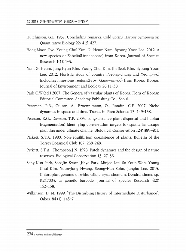 2018 생태·경관보전지역 정밀조사 동강유역 234 ? National Institute of Ecology Hutchinson, G.E. 1957. Concluding remarks. Cold Spring Harbor Symposia on Quantitative Biology 22415-427. Hong Moon-Pyo, Young-Chul Kim, Gi-Heum Nam, Byoung Yoon Lee. 2012. A new species of Zabelia Linnaeaceae from Korea. Journal of Species Research 1 1 1-3. Nam Gi Heum, Jung Hyun Kim, Young Chul Kim, Jin Seok Kim, Byoung Yoon Lee. 2012....