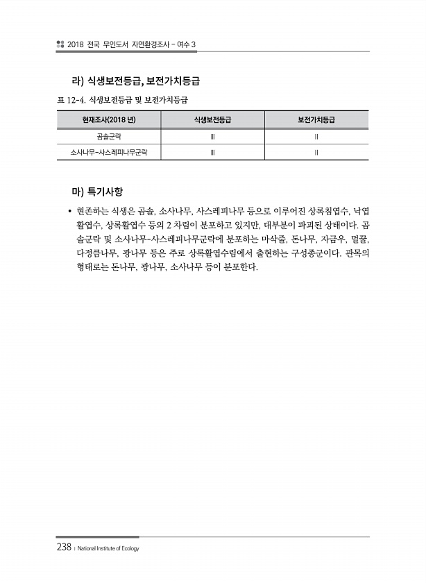 2018 전국 무인도서 자연환경조사 여수 3 238 ? National Institute of Ecology , 현재조사 2018 년 식생보전등급 보전가치등급 곰솔군락 Ⅲ Ⅱ 소사나무-사스레피나무군락 Ⅲ Ⅱ 표 12-4. 식생보전등급 및 보전가치등급 ? 현존하는 식생은 곰솔, 소사나무, 사스레피나무 등으로 이루어진 상록침엽수, 낙엽 활엽수, 상록활엽수 등의 2 차림이 분포하고 있지만, 대부분이 파괴된 상태이다. 곰 솔군락 및 소사나무-사스레피나무군락에 분포하는 마삭줄, 돈나무, 자금우, 멀꿀, 다정큼나무, 광나무 등은 주로 상록활엽수림에서 출현하는 구성종군이다. 관목의 형태로는 돈나무, 광나무, 소사나무 등이분포한다.