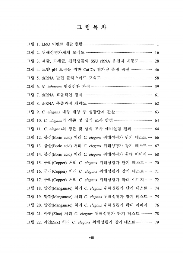 viii 그 림 목 차 그림 1. LMO 이벤트 개발 현황 ····································································· 1 그림 2. 위해성평가체계 모식도 ································································ 16 그림 3. 세균, 고세균, 진핵생물의 SSU rRNA 유전자 계통도 ··········· 28 그림 4. 토양 pH 보정을 위한 CaCO3 첨가량 측정 곡선 ···················· 46 그림 5. dsRNA 발현 플라스미드 모식도 ·············································· 58 그림 6. N. tabacum 형질전환 ...