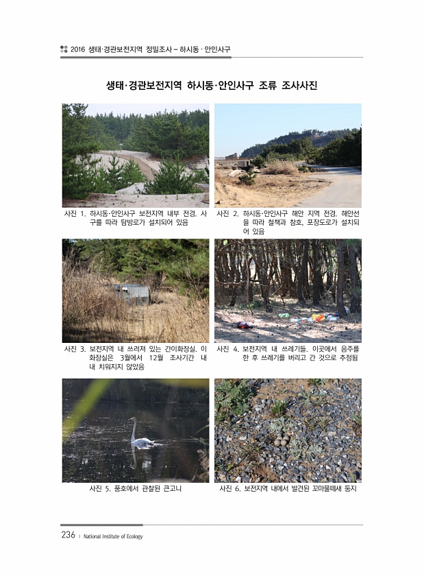 2016 생태·경관보전지역 정밀조사 하시동 · 안인사구 236 ? National Institute of Ecology 생태·경관보전지역 하시동·안인사구 조류 조사사진 사진 1. 하시동·안인사구 보전지역 내부 전경. 사 구를 따라 탐방로가 설치되어 있음 사진 2. 하시동·안인사구 해안 지역 전경. 해안선 을 따라 철책과 참호, 포장도로가 설치되 어 있음 사진 3. 보전지역 내 쓰러져 있는 간이화장실. 이 화장실은 3월에서 12월 조사기간 내 내 치워지지 않았음 사진 4. 보전지역 내 쓰레기들. 이곳에서 음주를 한 후 쓰레기를 버리고 간 것으로 추정됨 사진 5. 풍호에서 관찰된 큰고니 사진 6. 보전지역 내에서 발견된 꼬마물떼새둥지