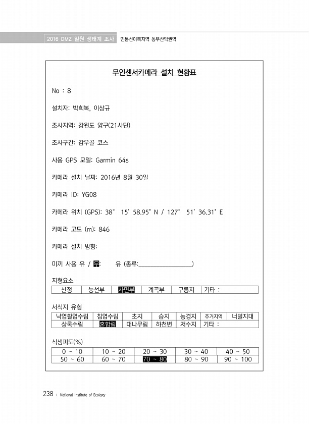 2016 DMZ 일원 생태계 조사 민통선이북지역 동부산악권역 238 ? National Institute of Ecology 무인센서카메라 설치 현황표 No 8 설치자박희복, 이상규 조사지역강원도 양구 21사단 조사구간감우골 코스 사용 GPS 모델Garmin 64s 카메라 설치 날짜2016년 8월 30일 카메라 IDYG08 카메라 위치 GPS 38° 15’ 58.95N 127° 51’ 36.31E 카메라 고도 m 846 카메라 설치 방향미끼 사용 유 무유 종류__________________ 지형요소 산정 능선부 사면부 계곡부 구릉지 기타 서식지 유형 낙엽활엽수림 침엽수림 초지 습지 농경지 주거지역 너덜지대 상록수림 혼합림 대나무림 하천변 저수지 기타 식생피도 % 0 10 10 20 20 30 30 40 4...