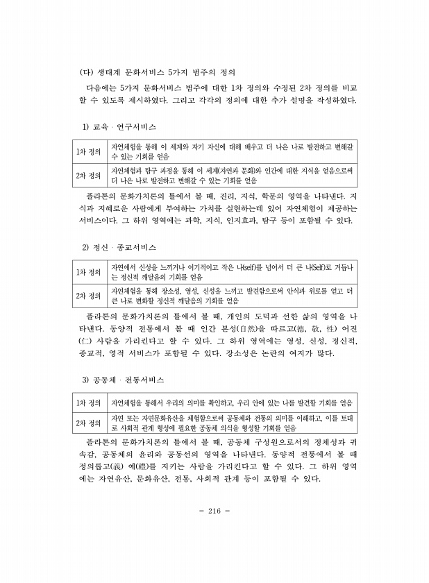 216 다 생태계 문화서비스 5가지 범주의 정의 다음에는 5가지 문화서비스 범주에 대한 1차 정의와 수정된 2차 정의를 비교 할 수 있도록 제시하였다. 그리고 각각의 정의에 대한 추가 설명을 작성하였다. 1 교육?연구서비스 1차 정의 자연체험을 통해 이 세계와 자기 자신에 대해 배우고 더 나은 나로 발전하고 변해갈 수 있는 기회를 얻음 2차 정의 자연체험과 탐구 과정을 통해 이 세계 자연과 문화 와 인간에 대한 지식을 얻음으로써 더 나은 나로 발전하고 변해갈 수 있는 기회를 얻음 플라톤의 문화가치론의 틀에서 볼 때, 진리, 지식, 학문의 영역을 나타낸다. 지 식과 지혜로운 사람에게 부여하는 가치를 실현하는데 있어 자연체험이 제공하는 서비스이다. 그 하위 영역에는 과학, 지식, 인지효과, 탐구 등이 포함될 수...