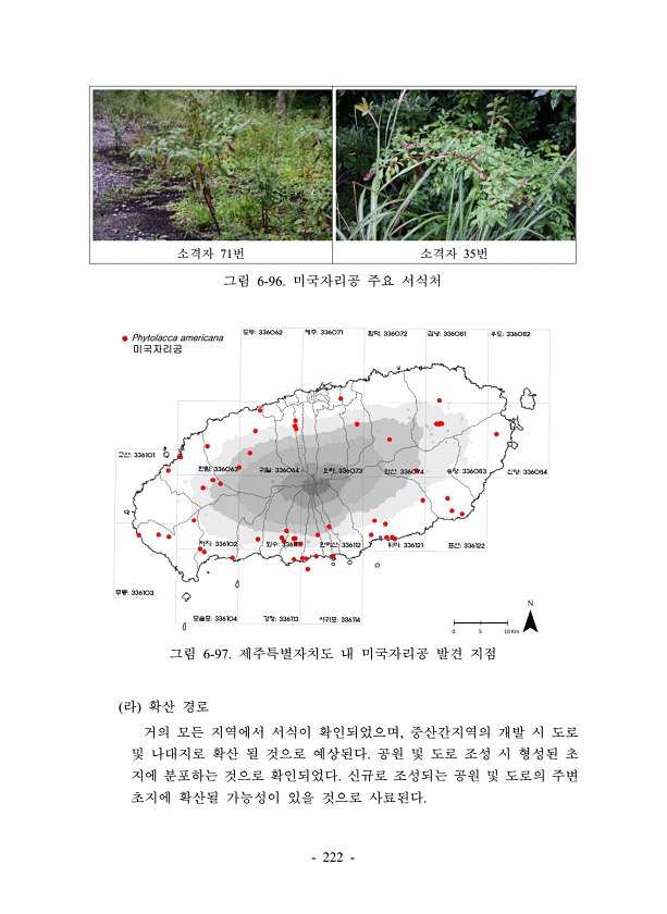 222 소격자 71번 소격자 35번 그림 6-96. 미국자리공 주요 서식처 그림 6-97. 제주특별자치도 내 미국자리공 발견 지점 라 확산 경로 거의 모든 지역에서 서식이 확인되었으며, 중산간지역의 개발 시 도로 및 나대지로 확산 될 것으로 예상된다. 공원 및 도로 조성 시 형성된 초 지에 분포하는 것으로 확인되었다. 신규로 조성되는 공원 및 도로의 주변 초지에 확산될 가능성이 있을 것으로사료된다.
