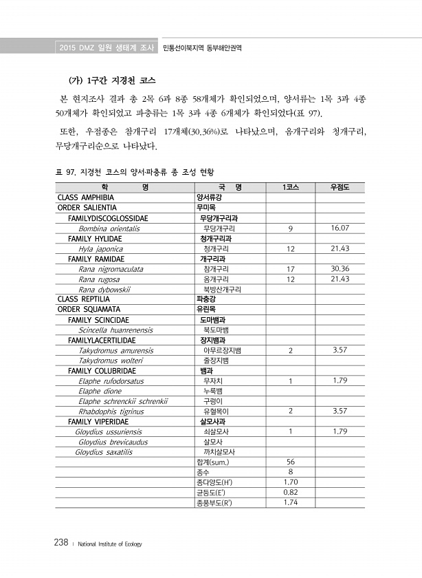 2015 DMZ 일원 생태계 조사 민통선이북지역 동부해안권역 238 ? National Institute of Ecology 가 1구간 지경천 코스 본 현지조사 결과 총 2목 6과 8종 58개체가 확인되었으며, 양서류는 1목 3과 4종 50개체가 확인되었고 파충류는 1목 3과 4종 6개체가 확인되었다 표 97 또한, 우점종은 참개구리 17개체 30.36% 로 나타났으며, 옴개구리와 청개구리, 무당개구리순으로 나타났다. 학 명 국 명 1코스 우점도 CLASS AMPHIBIA 양서류강 ORDER SALIENTIA 무미목 FAMILYDISCOGLOSSIDAE 무당개구리과 Bombina orientalis 무당개구리 9 16.07 FAMILY HYLIDAE 청개구리과 Hyla japonica 청개구리 12 21.4...