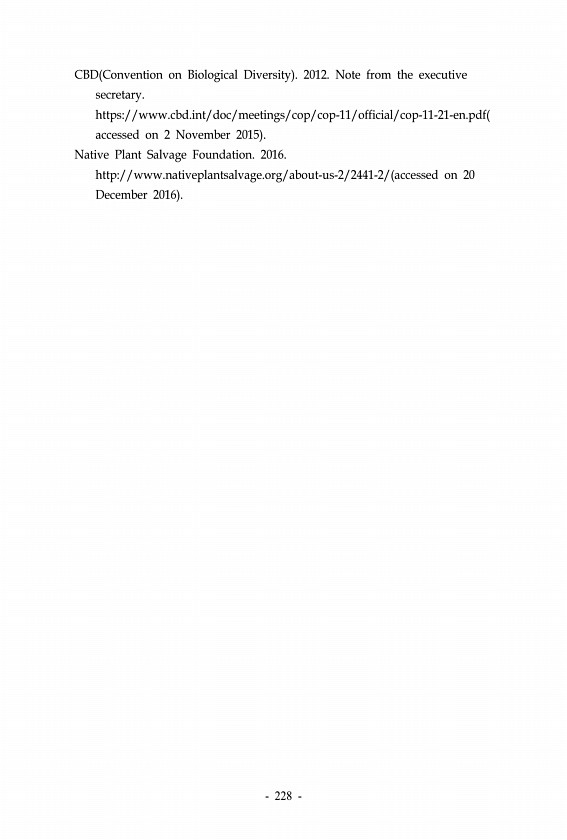 CBD Convention on Biological Diversity 2012. Note from the executive secretary. https//www.cbd.int/doc/meetings/cop/cop-11/official/cop-11-21-en.pdf accessed on 2 November 2015 Native Plant Salvage Foundation. 2016. http//www.nativeplantsalvage.org/about-us-2/2441-2/ accessed on 20 December 2016 228