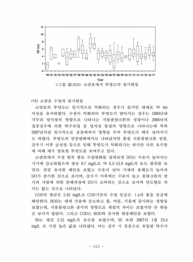 213 Year 90 91 92 93 94 95 96 97 98 99 00 01 02 03 04 05 06 07 08 09 10 11 12 13 14 15 16 17 SD m 8 6 4 2 0 10 12 그림 Ⅲ-113 소양호에서 투명도의 장기변동 마 소양호 수질의 장기변동 소양호의 투명도는 일시적으로 악화되는 경우가 있지만 대체로 약 4m 이상을 유지하였다. 수질이 악화되어 투명도가 얕아지는 경우는 1990년대 가두리 양식장의 영향으로 나타나는 식물플랑크톤의 성장이나 2006년의 집중강우에 의한 탁수유입 등 입자상 물질의 영향으로 나타나는데 특히 2007년처럼 일시적으로 표층에까지 영향을 주어 투명도가 매우 낮아지기 도 하였다. 투명도의 연중변화에서도 나타났지만 봄철 식물플랑크톤 성장, 강우기 이후 급성장...