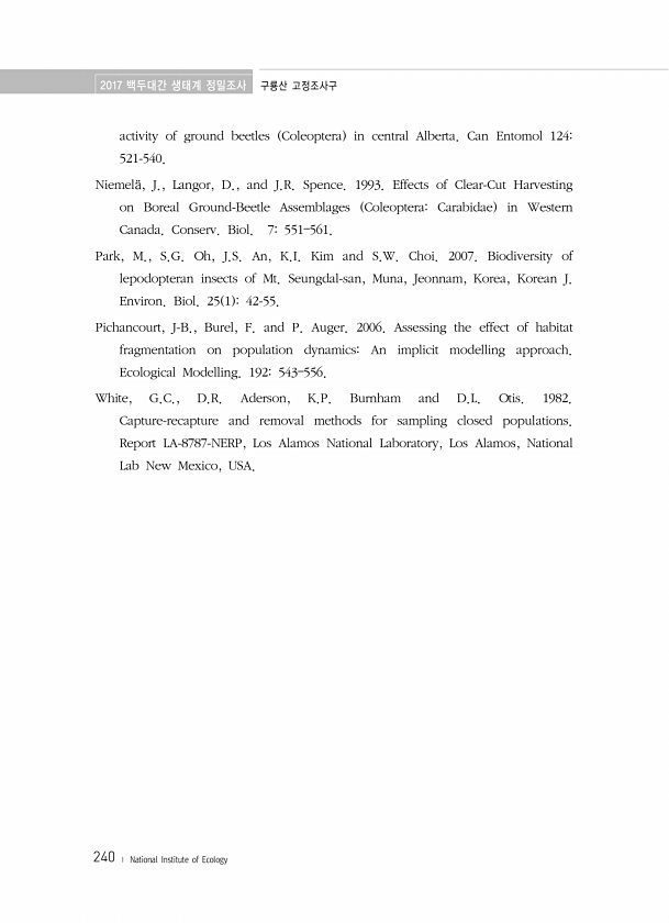 2017 백두대간 생태계 정밀조사 구룡산 고정조사구 240 ? National Institute of Ecology activity of ground beetles Coleoptera in central Alberta. Can Entomol 124521-540. Niemel?, J., Langor, D., and J.R. Spence. 1993. Effects of Clear-Cut Harvesting on Boreal Ground-Beetle Assemblages ColeopteraCarabidae in Western Canada. Conserv. Biol. 7551?561. Park, M., S.G. Oh, J.S. An, K.I. Kim and S.W. Choi. 2007. Biodiversity of...
