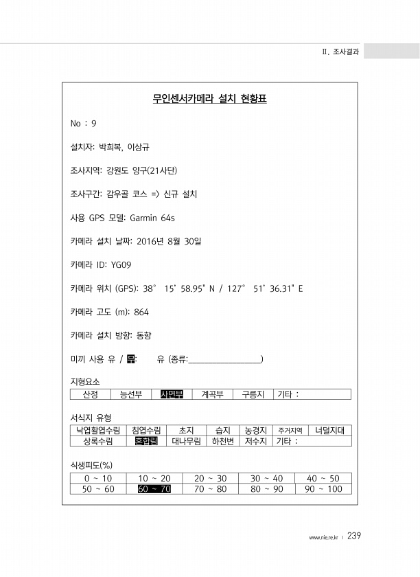 Ⅱ. 조사결과 www.nie.re.kr ? 239 무인센서카메라 설치 현황표 No 9 설치자박희복, 이상규 조사지역강원도 양구 21사단 조사구간감우골 코스 = 신규 설치 사용 GPS 모델Garmin 64s 카메라 설치 날짜2016년 8월 30일 카메라 IDYG09 카메라 위치 GPS 38° 15’ 58.95N 127° 51’ 36.31E 카메라 고도 m 864 카메라 설치 방향동향 미끼 사용 유 무유 종류__________________ 지형요소 산정 능선부 사면부 계곡부 구릉지 기타 서식지 유형 낙엽활엽수림 침엽수림 초지 습지 농경지 주거지역 너덜지대 상록수림 혼합림 대나무림 하천변 저수지 기타 식생피도 % 0 10 10 20 20 30 30 40 40 50 50 60 60 70 70 80 80 90 90...