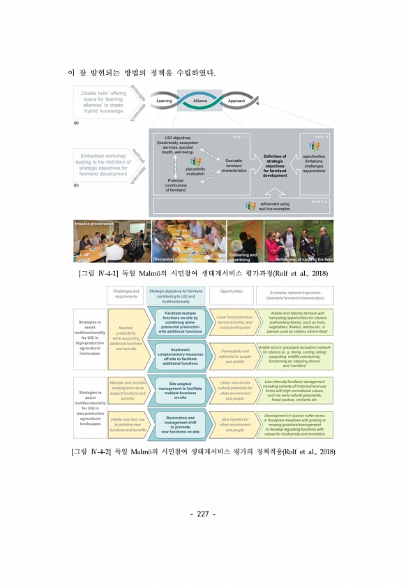 227 이 잘 발현되는 방법의 정책을 수립하였다. [그림 Ⅳ-4-1] 독일 Malm?의 시민참여 생태계서비스 평가과정 Rolf et al., 2018 [그림 Ⅳ-4-2] 독일 Malm?의 시민참여 생태계서비스 평가의 정책적용 Rolf et al., 2018