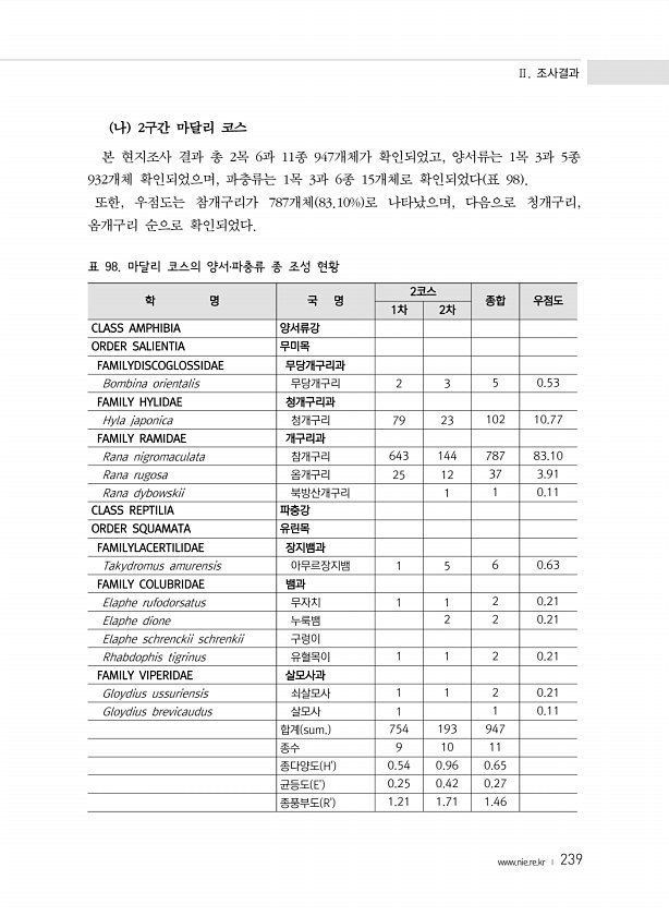 Ⅱ. 조사결과 www.nie.re.kr ? 239 나 2구간 마달리 코스 본 현지조사 결과 총 2목 6과 11종 947개체가 확인되었고, 양서류는 1목 3과 5종 932개체 확인되었으며, 파충류는 1목 3과 6종 15개체로 확인되었다 표 98 또한, 우점도는 참개구리가 787개체 83.10% 로 나타났으며, 다음으로 청개구리, 옴개구리 순으로 확인되었다. 학 명 국 명 2코스 종합 우점도 1차 2차 CLASS AMPHIBIA 양서류강 ORDER SALIENTIA 무미목 FAMILYDISCOGLOSSIDAE 무당개구리과 Bombina orientalis 무당개구리 2 3 5 0.53 FAMILY HYLIDAE 청개구리과 Hyla japonica 청개구리 79 23 102 10.77 FAMILY RAMIDAE ...