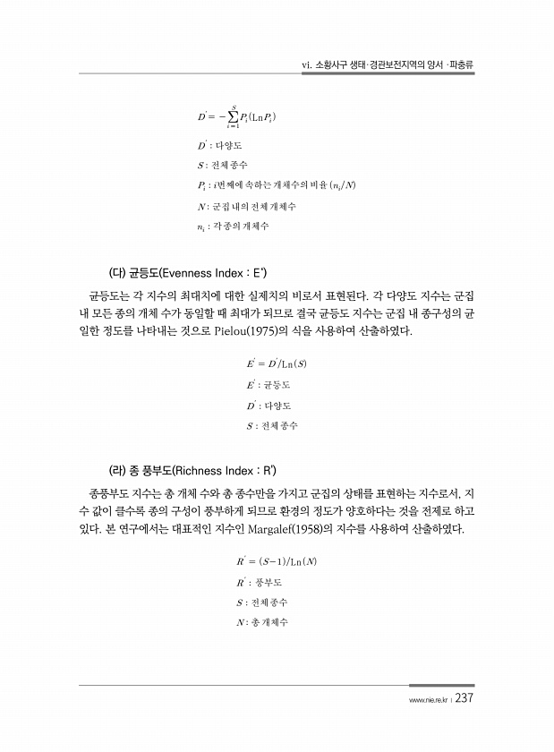 vi. 소황사구 생태·경관보전지역의 양서 ·파충류 www.nie.re.kr ?237 ′ ? ?Ln? ′ 다양도 전체종수 ? ?번째에속하는개채수의비율 ?? 군집내의전체개체수 ? ? 각종의개체수 다 균등도 Evenness Index E‘ 균등도는 각 지수의 최대치에 대한 실제치의 비로서 표현된다. 각 다양도 지수는 군집 내 모든 종의 개체 수가 동일할 때 최대가 되므로 결국 균등도 지수는 군집 내 종구성의 균 일한 정도를 나타내는 것으로 Pielou 1975 의 식을 사용하여 산출하였다. ′ ′Ln ′ 균등도 ′ 다양도 전체 종수 라 종 풍부도 Richness Index R종풍부도 지수는 총 개체 수와...