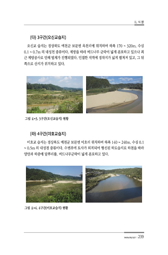 ii. 식 생 www.nie.re.kr ?239 3 오신교 습지는 경상북도 예천군 보문면 옥천리에 위치하며 하폭 170 320m, 수심 0.1 0.7m 의 내성천 중류이다. 제방을 따라 버드나무 군락이 넓게 분포하고 있으나 최 근 제방공사로 인해 벌채가 진행되었다. 인접한 지역에 경작지가 넓게 펼쳐져 있고, 그 뒤 쪽으로 산지가 위치하고 있다. 그림 ⅱ-3. 3구간 오신교습지 현황 4 미호교 습지는 경상북도 예천군 보문면 미호리 위치하며 하폭 140 240m, 수심 0.1 0.5m 의 내성천 중류이다. 수변부에 토사가 퇴적되어 형선된 하도습지로 하천을 따라 양안과 하중에 달뿌리풀, 버드나무군락이 넓게 분포하고 있다. 그림 ⅱ-4. 4구간 미호교습지현황