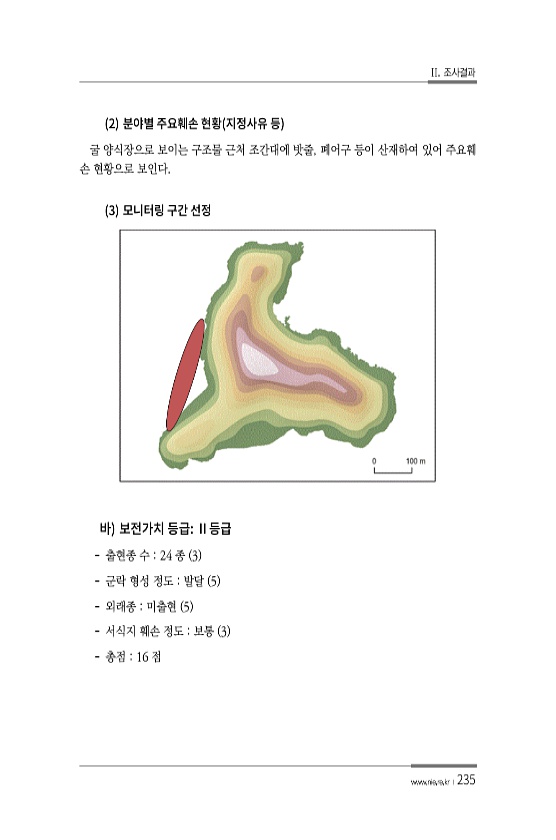 II. 조사결과 www.nie.re.kr ?235 2 굴 양식장으로 보이는 구조물 근처 조간대에 밧줄, 폐어구 등이 산재하여 있어 주요훼 손 현황으로 보인다. 3 출현종 수 24 종 3 군락 형성 정도 발달 5 외래종 미출현 5 서식지 훼손 정도 보통 3 총점 16점