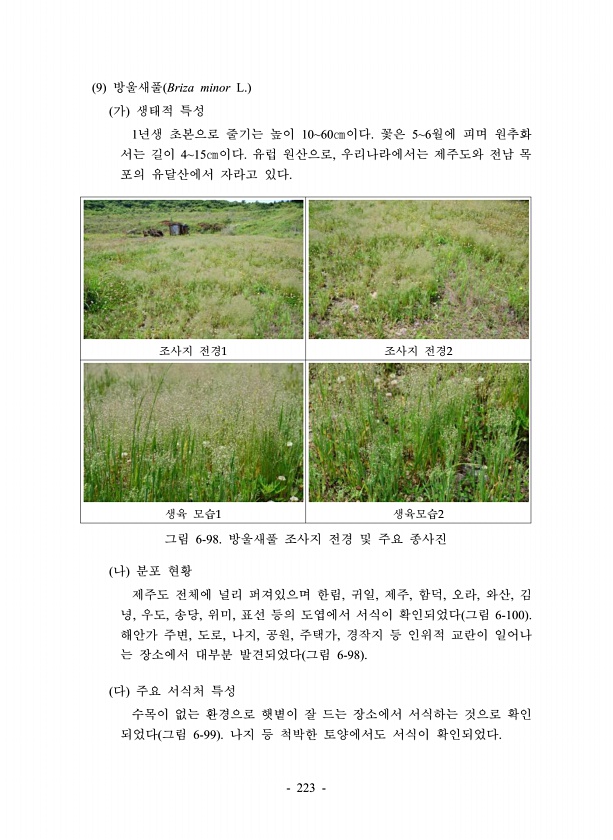 223 9 방울새풀 Briza minor L. 가 생태적 특성 1년생 초본으로 줄기는 높이 1060㎝이다. 꽃은 56월에 피며 원추화 서는 길이 415㎝이다. 유럽 원산으로, 우리나라에서는 제주도와 전남 목 포의 유달산에서 자라고 있다. 조사지 전경1 조사지 전경2 생육 모습1 생육모습2 그림 6-98. 방울새풀 조사지 전경 및 주요 종사진 나 분포 현황 제주도 전체에 널리 퍼져있으며 한림, 귀일, 제주, 함덕, 오라, 와산, 김 녕, 우도, 송당, 위미, 표선 등의 도엽에서 서식이 확인되었다 그림 6-100 해안가 주변, 도로, 나지, 공원, 주택가, 경작지 등 인위적 교란이 일어나 는 장소에서 대부분 발견되었다 그림 6-98 다 주요 서식처 특성 수목이 없는 환경으로 햇볕이 잘 드는 장소에서 서식하는 것...