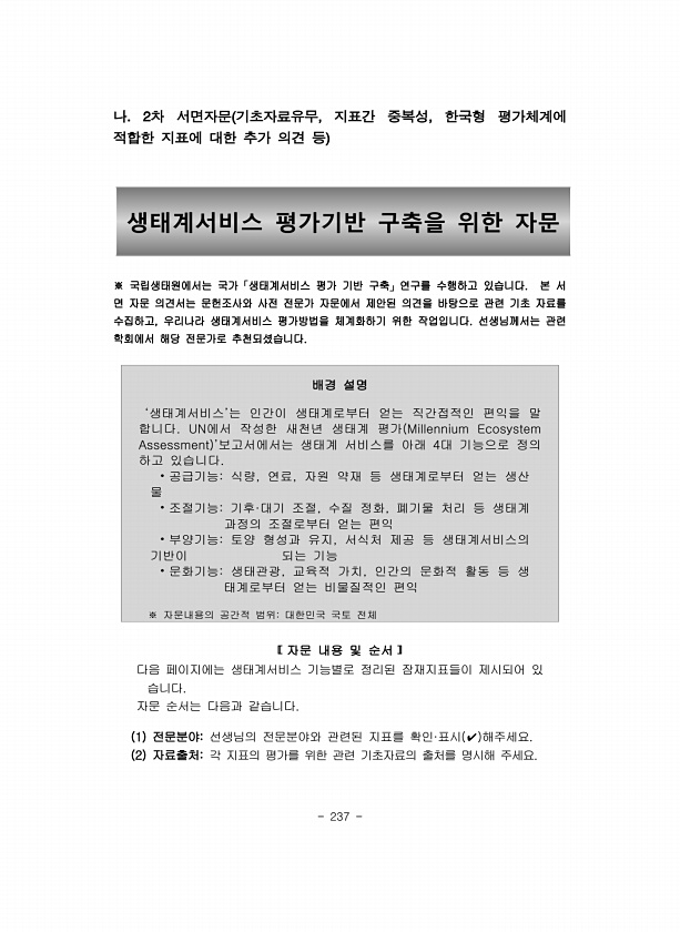 237 생태계서비스 평가기반 구축을 위한 자문 나 차 서면자문 기초자료유무 지표간 중복성 한국형 평가체계에 적합한 지표에 대한 추가 의견 등 ※ 국립생태원에서는 국가「생태계서비스 평가 기반 구축」연구를 수행하고 있습니다. 본 서 면 자문 의견서는 문헌조사와 사전 전문가 자문에서 제안된 의견을 바탕으로 관련 기초 자료를 수집하고, 우리나라 생태계서비스 평가방법을 체계화하기 위한 작업입니다. 선생님께서는 관련 학회에서 해당 전문가로 추천되셨습니다. 배경 설명 ‘생태계서비스’는 인간이 생태계로부터 얻는 직간접적인 편익을 말 합니다. UN에서 작성한 새천년 생태계 평가 Millennium Ecosystem Assessment ’보고서에서는 생태계 서비스를 아래 4대 기능으로 정의 하고 있습니다. ?공급기능식량, 연...
