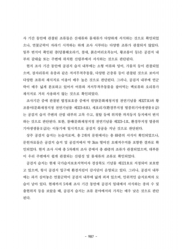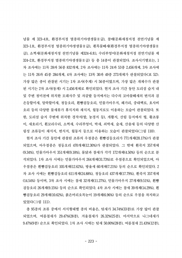 223 념물 제 호 환경부지정 멸종위기야생생물 급 참매 문화재청지정 천연기념물 제 323-4 , Ⅱ , 323-1 , 호 환경부지정 멸종위기야생생물 급 흰목물떼새 환경부지정 멸종위기야생생물 Ⅱ , Ⅱ 급 소쩍새 문화재청지정 천연기념물 제 호 수리부엉이 문화재청지정 천연기념물 제 , 324-6 , 324-2 , 호 환경부지정 멸종위기야생생물 급 등 총 종이 관찰되었다 조사시기별로는 Ⅱ 14 , 1 차 조사에는 목 과 종 개체 차 조사에는 목 과 종 개체 차 조사에 11 28 56 832 , 2 11 24 53 2,456 , 3 는 목 과 종 개체 차 조사에는 목 과 종 개체가 관찰되었다 표 11 26 45 284 , 4 13 30 49 273 52 가장 많은 종이 관찰된 시기는 차 조사 추계 시 종이였으며 가...