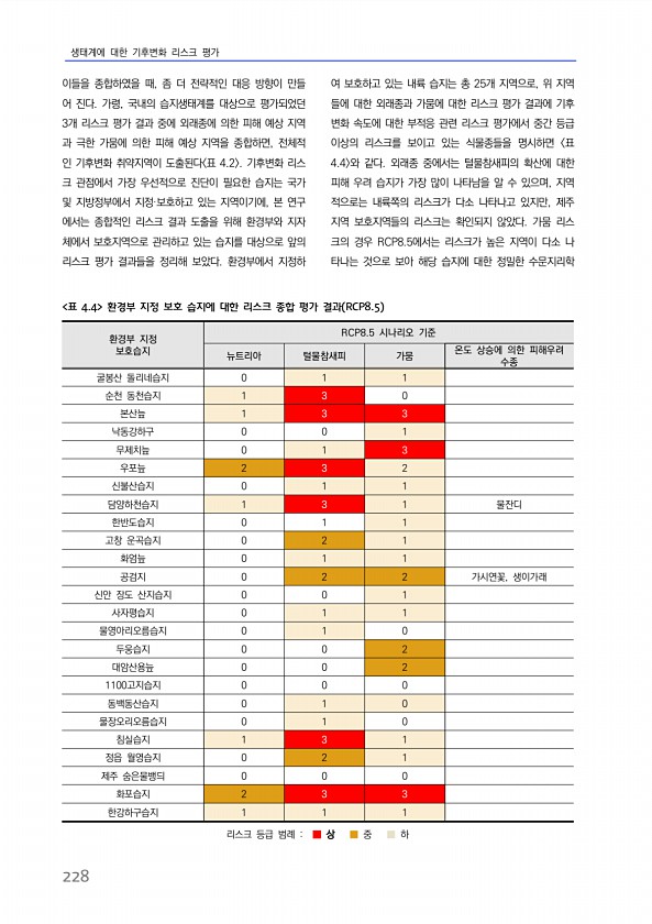 생태계에 대한 기후변화 리스크 평가 228 이들을 종합하였을 때, 좀 더 전략적인 대응 방향이 만들 어 진다. 가령, 국내의 습지생태계를 대상으로 평가되었던 3개 리스크 평가 결과 중에 외래종에 의한 피해 예상 지역 과 극한 가뭄에 의한 피해 예상 지역을 종합하면, 전체적 인 기후변화 취약지역이 도출된다 표 4.2 기후변화 리스 크 관점에서 가장 우선적으로 진단이 필요한 습지는 국가 및 지방정부에서 지정·보호하고 있는 지역이기에, 본 연구 에서는 종합적인 리스크 결과 도출을 위해 환경부와 지자 체에서 보호지역으로 관리하고 있는 습지를 대상으로 앞의 리스크 평가 결과들을 정리해 보았다. 환경부에서 지정하 여 보호하고 있는 내륙 습지는 총 25개 지역으로, 위 지역 들에 대한 외래종과 가뭄에 대한 리스크 평가 ...