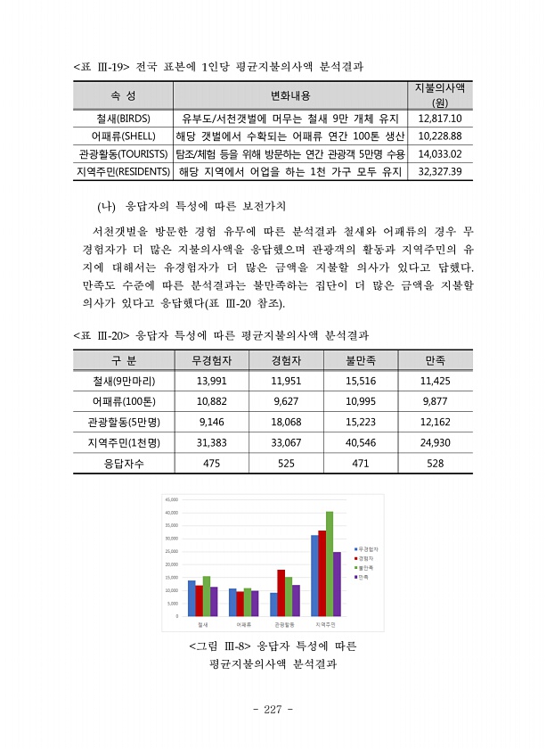 227 속 성 변화내용 지불의사액 원 철새 BIRDS 유부도/서천갯벌에 머무는 철새 9만 개체 유지 12,817.10 어패류 SHELL 해당 갯벌에서 수확되는 어패류 연간 100톤 생산 10,228.88 관광활동 TOURISTS 탐조/체험 등을 위해 방문하는 연간 관광객 5만명 수용 14,033.02 지역주민 RESIDENTS 해당 지역에서 어업을 하는 1천 가구 모두 유지 32,327.39 표 전국 표본에 인당 평균지불의사액 분석결과 나 응답자의 특성에 따른 보전가치 서천갯벌을 방문한 경험 유무에 따른 분석결과 철새와 어패류의 경우 무 경험자가 더 많은 지불의사액을 응답했으며 관광객의 활동과 지역주민의 유 지에 대해서는 유경험자가 더 많은 금액을 지불할 의사가 있다고 답했다 만족도 수준에 따른 분석결과는 ...