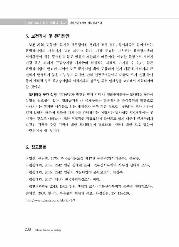 2017 DMZ 일원 생태계 조사 민통선이북지역 서부평야권역 238 ? National Institute of Ecology 5. 보전가치 및 관리방안 보전 지역민통선이북지역 서부평야권 생태계 조사 결과, 양서파충류 분야에서는 표범장지뱀의 서식지가 보전 되어야 한다. 가장 중요한 이유로는 표범장지뱀의 서식환경이 매우 뚜렷하고 분포 범위가 제한되기 때문이다. 이러한 특징으로 서식지 변경 혹은 파괴가 표범장지뱀 개체군의 직접적인 피해로 이어질 수 있다. 물론 표범장지뱀이 발견된 지역이 모두 군사시설 내에 포함되어 있기 때문에 서식지의 큰 변화가 발생하지 않을 가능성이 있지만, 만약 인공구조물이나 대규모 토지 변경 공사 등이 계획될 경우 표범장지뱀의 서식지와의 접근성 혹은 연관성을 고려해서 계획되어야 할 것이다....