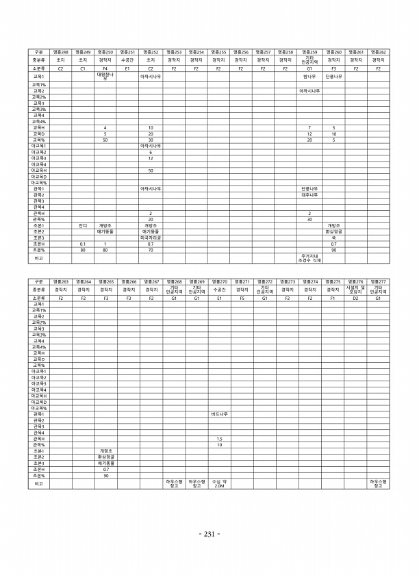 구분 영흥248 영흥249 영흥250 영흥251 영흥252 영흥253 영흥254 영흥255 영흥256 영흥257 영흥258 영흥259 영흥260 영흥261 영흥262 중분류 초지 초지 경작지 수공간 초지 경작지 경작지 경작지 경작지 경작지 경작지 기타 인공지역 경작지 경작지 경작지 소분류 C2 C1 F4 E1 C2 F2 F2 F2 F2 F2 F2 G1 F3 F2 F2 교목1 대왕참나 무 아까시나무 밤나무 단풍나무 교목1% 교목2 아까시나무 교목2% 교목3 교목3% 교목4 교목4% 교목H 4 10 7 5 교목D 5 20 12 10 교목% 50 30 20 5 아교목1 아까시나무 아교목2 6 아교목3 12 아교목4 아교목H 50 아교목D 아교목% 관목1 아까시나무 단풍나무 관목2 대추나무 관목3 관목4 관목H 2...
