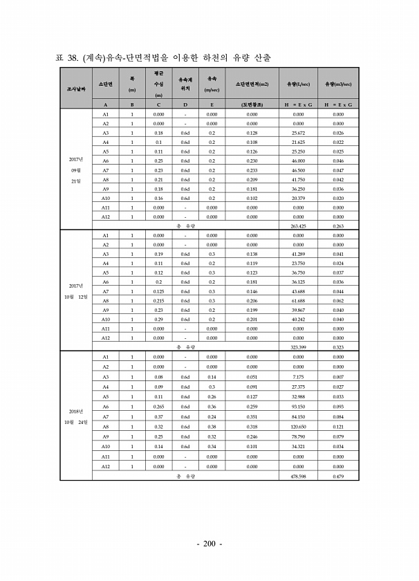 200 표 38. 계속 유속-단면적법을 이용한 하천의 유량 산출 조사날짜 소단면 폭 m 평균 수심 m 유속계 위치 유속 m/sec 소단면면적 m2 유량 L/sec 유량 m3/sec A B C D E 도면참조 H = E x G H = E x G 2017년 09월 21일 A1 1 0.000 0.000 0.000 0.000 0.000 A2 1 0.000 0.000 0.000 0.000 0.000 A3 1 0.18 0.6d 0.2 0.128 25.672 0.026 A4 1 0.1 0.6d 0.2 0.108 21.625 0.022 A5 1 0.11 0.6d 0.2 0.126 25.250 0.025 A6 1 0.25 0.6d 0.2 0.230 46.000 0.046 A7 1 0.23 0.6d 0.2 0.233 46.5...