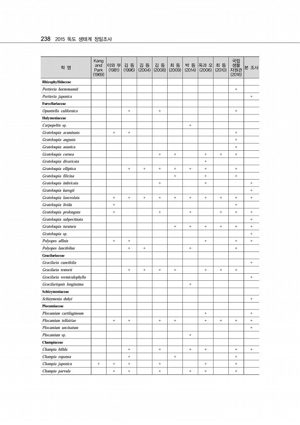 238 2015 독도 생태계 정밀조사 학 명 Kang and Park 1969 이와 부 1981 김 등 1996 김 등 2004 김 등 2008 최 등 2009 박 등 2014 옥과 오 2006 최 등 2010 국립 생물 자원관 2016 본 조사 Rhizophyllidaceae Portieria hornemannii + Portieria japonica + Furcellariaceae Opuntiella californica + + + Halymeniaceae Carpopeltis sp. + Grateloupia acuminata + + + Grateloupia angusta + Grateloupia asiatica + Grateloupia cornea + + + + + Grateloupia divarica...