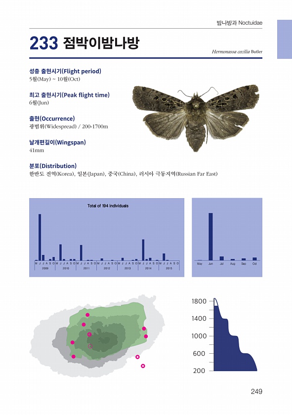 249 밤나방과 Noctuidae Hermonassa cecilia Butler 성충 출현시기 Flight period 5월 May 10월 Oct 최고 출현시기 Peak fight time 6월 Jun 출현 Occurrence 광범위 Widespread 200-1700m 날개편길이 Wingspan 41mm 분포 Distribution 한반도 전역 Korea , 일본 Japan , 중국 China , 러시아 극동지역 Russian Far East 233 점박이밤나방 M J J A S O M J J A S O M J J A S O M J J A S O M J J A S O M J J A S O M J J A S O May Jun Jul Aug Sep Oct 2009 2010 2011 2012 2013 2014 ...