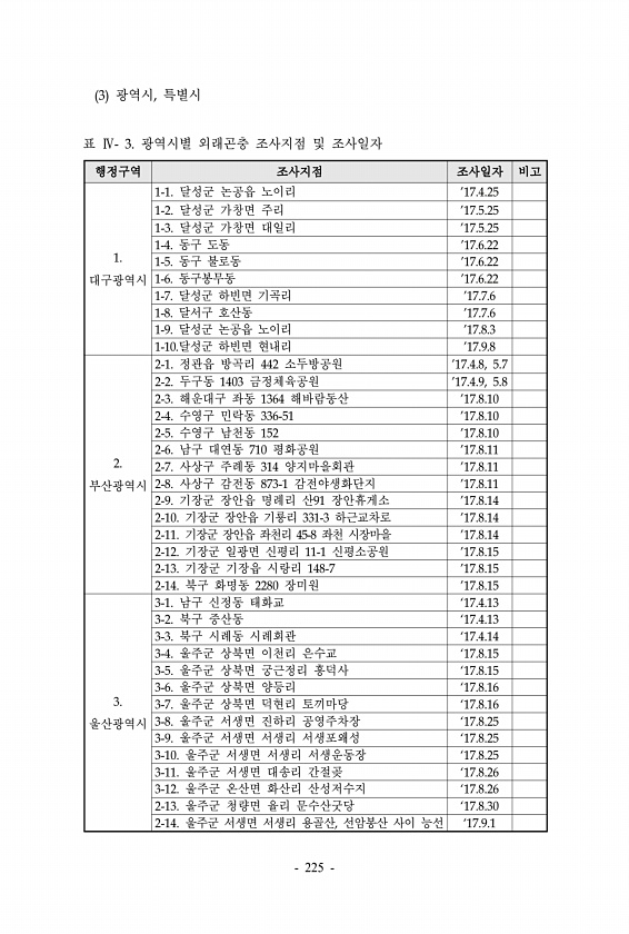 3 광역시, 특별시 표 Ⅳ- 3. 광역시별 외래곤충 조사지점 및 조사일자 행정구역 조사지점 조사일자 비고 1. 대구광역시 1-1. 달성군 논공읍 노이리 17.4.25 1-2. 달성군 가창면 주리 17.5.25 1-3. 달성군 가창면 대일리 17.5.25 1-4. 동구 도동 17.6.22 1-5. 동구 불로동 17.6.22 1-6. 동구봉무동 17.6.22 1-7. 달성군 하빈면 기곡리 17.7.6 1-8. 달서구 호산동 17.7.6 1-9. 달성군 논공읍 노이리 17.8.3 1-10.달성군 하빈면 현내리 17.9.8 2. 부산광역시 2-1. 정관읍 방곡리 442 소두방공원 17.4.8, 5.7 2-2. 두구동 1403 금정체육공원 17.4.9, 5.8 2-3. 해운대구 좌동 1364 해바람동산 17.8.10...