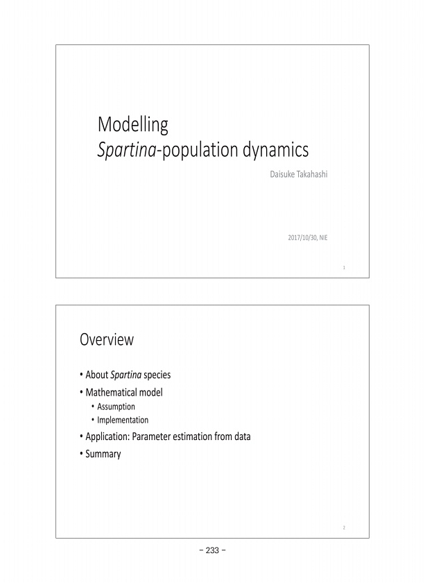 Overview ? About Spartina species ? Mathematical model ? Assumption ? Implementation ? ApplicationParameter estimation from data ? Summary 2 Modelling Spartina-population dynamics Daisuke Takahashi 2017/10/30, NIE 1 233