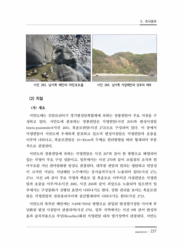 Ⅱ. 조사결과 www.nie.re.kr ? 237 사진 263. 남서쪽 해안의 마린포트홀 사진 264. 남서쪽 자갈해안과 상부의 애추 2 지질 가 개요 서만도에는 선캄브리아기 경기변성암복합체에 속하는 장봉편암이 주요 지질을 구 성하고 있다. 서만도에 분포하는 장봉편암은 석영편암 사진 265 과 변성사질암 meta-psammite 사진 266 , 흑운모편암 사진 272 으로 구성되어 있다. 이 중에서 석영편암이 서만도에 우세하게 분포하고 있으며 변성사질암은 석영편암과 호층을 이루며 나타나고, 흑운모편암은 1030cm의 두께로 편리방향을 따라 협재되어 부분 적으로 관찰된다. 서만도의 장봉편암에 속하는 석영편암은 사진 267과 같이 한 방향으로 배열되어 있는 석영이 주요 구성 성분이고, 일부에서는 사진 270과 ...