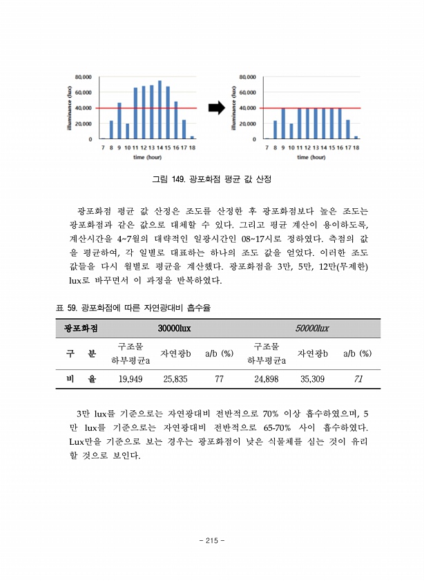 그림 149. 광포화점 평균 값 산정 광포화점 평균 값 산정은 조도를 산정한 후 광포화점보다 높은 조도는 광포화점과 같은 값으로 대체할 수 있다. 그리고 평균 계산이 용이하도록, 계산시간을 47월의 대략적인 일광시간인 0817시로 정하였다. 측점의 값 을 평균하여, 각 일별로 대표하는 하나의 조도 값을 얻었다. 이러한 조도 값들을 다시 월별로 평균을 계산했다. 광포화점을 3만, 5만, 12만 무제한 lux로 바꾸면서 이 과정을 반복하였다. 광포화점 30000lux 50000lux 구 분 구조물 하부평균a 자연광b a/b % 하부평균 구조물 a 자연광b a/b % 비 율 19,949 25,835 77 24,898 35,309 71 표 59. 광포화점에 따른 자연광대비 흡수율 3만 lux를 기준으로는 자연광대비...