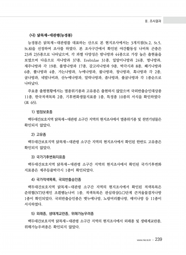 Ⅱ. 조사결과 www.nie.re.kr ? 239 나 닭목재대관령 능경봉 능경봉은 닭목재∼대관령를 대표하는 산으로 본 현지조사에서는 3개지점 St.2, St.5, St.8 을 선정하여 조사를 하였다. 본 조사구간에서 확인된 야간활동성 나비목 곤충은 23과 235종으로 나타났으며, 각 과별 다양성은 밤나방과 44종으로 가장 높은 출현율을 보였으며 다음으로 자나방과 37종, Erebidae 31종, 잎말이나방과 24종, 명나방과, 재주나방과 각 19종, 풀명나방과 17종, 갈고리나방과 9종, 박각시과 8종, 쐐기나방과 6종, 뿔나방과 4종, 가는나방과, 누에나방과, 불나방과, 창나방과, 혹나방과 각 2종, 굴나방과, 네발나비과, 산누에나방과, 알락나방과, 좀나방과, 풀굴나방과 각 1종순으로 나타났다. 주요종 출...