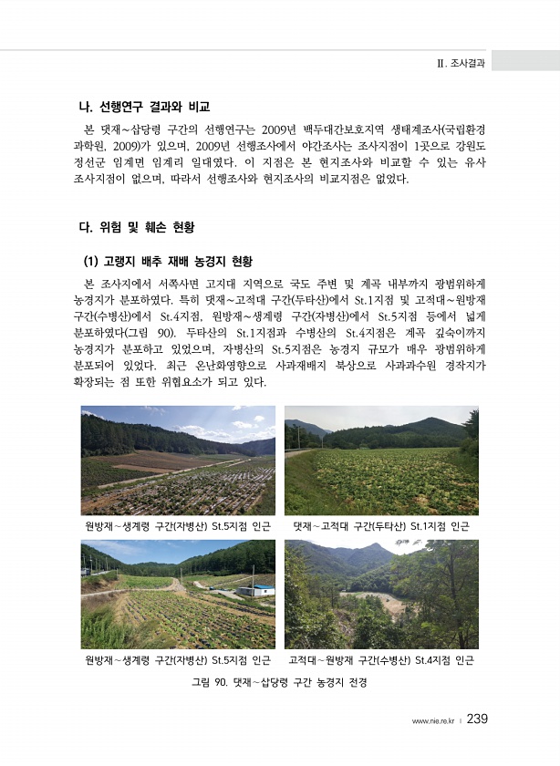 Ⅱ. 조사결과 www.nie.re.kr ? 239 나. 선행연구 결과와 비교 본 댓재∼삽당령 구간의 선행연구는 2009년 백두대간보호지역 생태계조사 국립환경 과학원, 2009 가 있으며, 2009년 선행조사에서 야간조사는 조사지점이 1곳으로 강원도 정선군 임계면 임계리 일대였다. 이 지점은 본 현지조사와 비교할 수 있는 유사 조사지점이 없으며, 따라서 선행조사와 현지조사의 비교지점은 없었다. 다. 위험 및 훼손 현황 1 고랭지 배추 재배 농경지 현황 본 조사지에서 서쪽사면 고지대 지역으로 국도 주변 및 계곡 내부까지 광범위하게 농경지가 분포하였다. 특히 댓재∼고적대 구간 두타산 에서 St.1지점 및 고적대∼원방재 구간 수병산 에서 St.4지점, 원방재∼생계령 구간 자병산 에서 St.5지점 등에서 넓게 분포하...