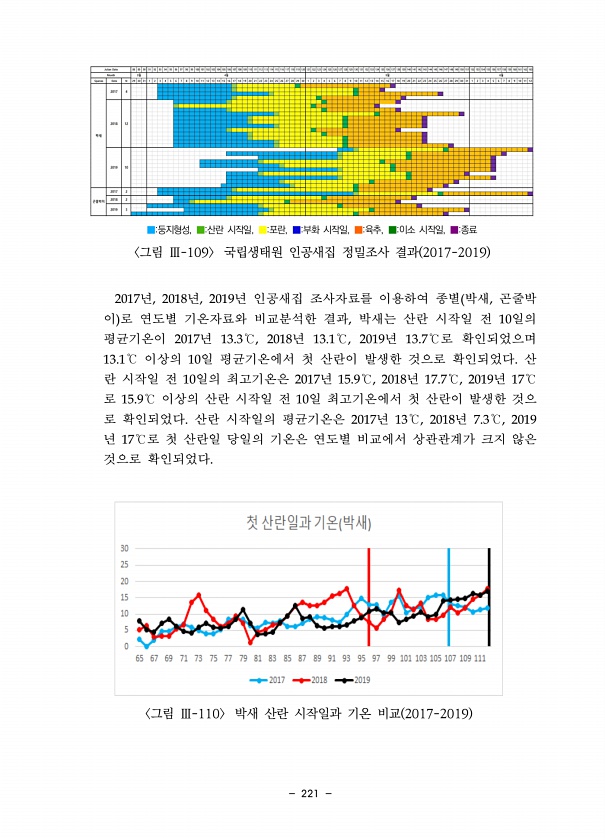 221 ■둥지형성, ■산란 시작일, ■포란, ■부화 시작일, ■육추, ■이소 시작일, ■종료 그림 Ⅲ-109 국립생태원 인공새집 정밀조사 결과 2017-2019 2017년, 2018년, 2019년 인공새집 조사자료를 이용하여 종별 박새, 곤줄박 이 로 연도별 기온자료와 비교분석한 결과, 박새는 산란 시작일 전 10일의 평균기온이 2017년 13.3℃, 2018년 13.1℃, 2019년 13.7℃로 확인되었으며 13.1℃ 이상의 10일 평균기온에서 첫 산란이 발생한 것으로 확인되었다. 산 란 시작일 전 10일의 최고기온은 2017년 15.9℃, 2018년 17.7℃, 2019년 17℃ 로 15.9℃ 이상의 산란 시작일 전 10일 최고기온에서 첫 산란이 발생한 것으 로 확인되었다. 산란 시작일의 평균기온은 20...