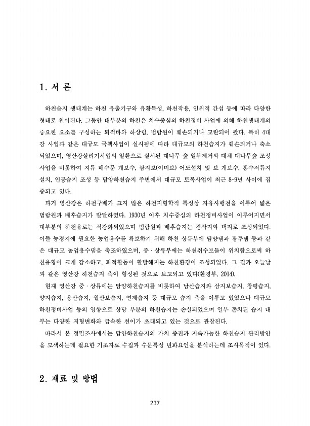 237 1. 서 론 하천습지 생태계는 하천 유출기구와 유황특성, 하천작용, 인위적 간섭 등에 따라 다양한 형태로 천이된다. 그동안 대부분의 하천은 치수중심의 하천정비 사업에 의해 하천생태계의 중요한 요소를 구성하는 퇴적바와 하상림, 범람원이 훼손되거나 교란되어 왔다. 특히 4대 강 사업과 같은 대규모 국책사업이 실시됨에 따라 대규모의 하천습지가 훼손되거나 축소 되었으며, 영산강살리기사업의 일환으로 실시된 대나무 숲 일부제거와 대체 대나무숲 조성 사업을 비롯하여 지류 배수문 개보수, 삼지보 이미보 어도설치 및 보 개보수, 홍수저류지 설치, 인공습지 조성 등 담양하천습지 주변에서 대규모 토목사업이 최근 89년 사이에 집 중되고 있다. 과거 영산강은 하천구배가 크지 않은 하천지형학적 특성상 자유사행천을 이루어 넓...
