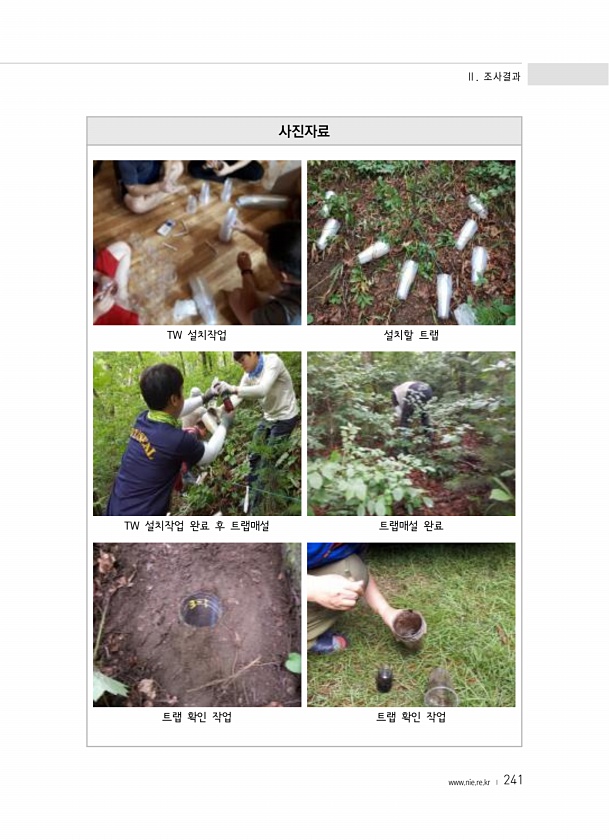 Ⅱ. 조사결과 www.nie.re.kr ? 241 사진자료 TW 설치작업 설치할 트랩 TW 설치작업 완료 후 트랩매설 트랩매설 완료 트랩 확인 작업 트랩 확인작업