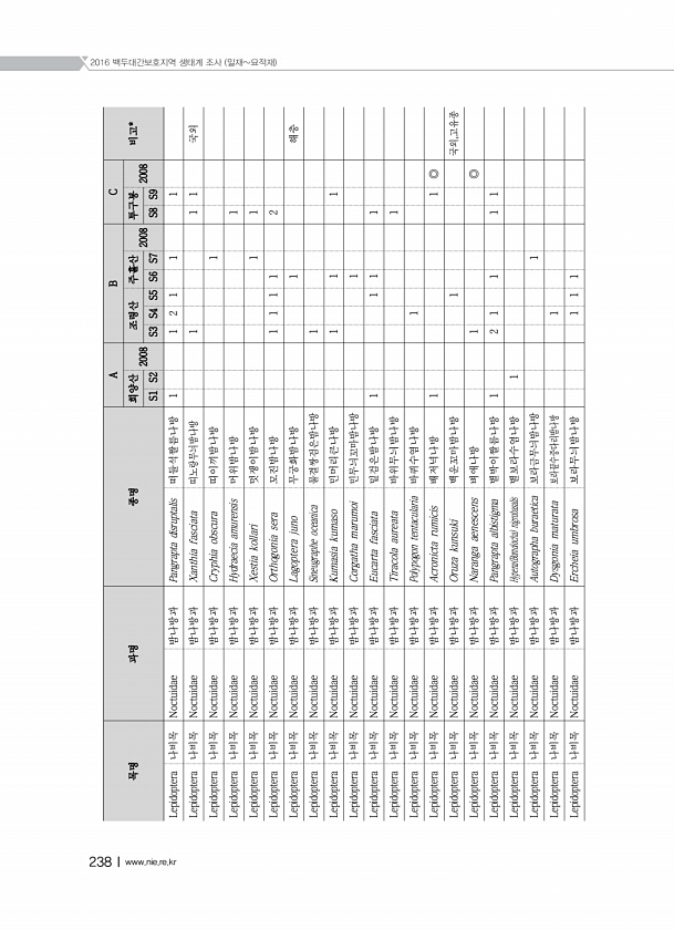 2016 백두대간보호지역 생태계 조사 밀재묘적재 238Ⅰwww.nie.re.kr 목명 과명 종명 A B C 희양산 비고* 2008 조령산 주흘산 2008 투구봉 2008 S1 S2 S3 S4 S5 S6 S7 S8 S9 Lepidoptera 나비목 Noctuidae 밤나방과 Pangrapta disruptalis 떠들석짤름나방 1 1 2 1 1 1 Lepidoptera 나비목 Noctuidae 밤나방과 Xanthia fasciata 띠노랑무늬밤나방 1 1 1 국외 Lepidoptera 나비목 Noctuidae 밤나방과 Cryphia obscura 띠이끼밤나방 1 Lepidoptera 나비목 Noctuidae 밤나방과 Hydraecia amurensis 머위밤나방 1 Lepidoptera 나비목 Noctuida...