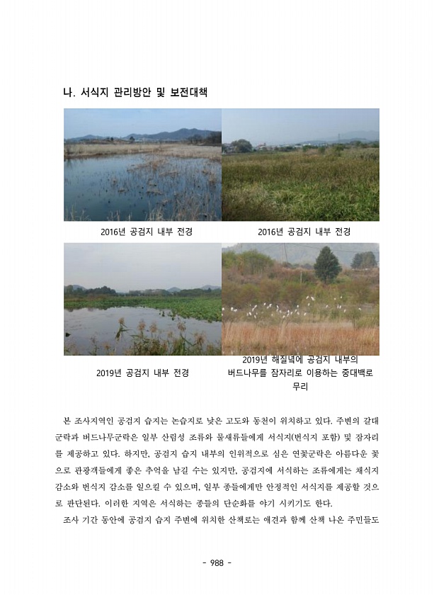 988 나. 서식지 관리방안 및 보전대책 2016년 공검지 내부 전경 2016년 공검지 내부 전경 2019년 공검지 내부 전경 2019년 해질녘에 공검지 내부의 버드나무를 잠자리로 이용하는 중대백로 무리 본 조사지역인 공검지 습지는 논습지로 낮은 고도와 동천이 위치하고 있다. 주변의 갈대 군락과 버드나무군락은 일부 산림성 조류와 물새류들에게 서식지 번식지 포함 및 잠자리 를 제공하고 있다. 하지만, 공검지 습지 내부의 인위적으로 심은 연꽃군락은 아름다운 꽃 으로 관광객들에게 좋은 추억을 남길 수는 있지만, 공검지에 서식하는 조류에게는 채식지 감소와 번식지 감소를 일으킬 수 있으며, 일부 종들에게만 안정적인 서식지를 제공할 것으 로 판단된다. 이러한 지역은 서식하는 종들의 단순화를 야기 시키기도 한다. 조사 ...