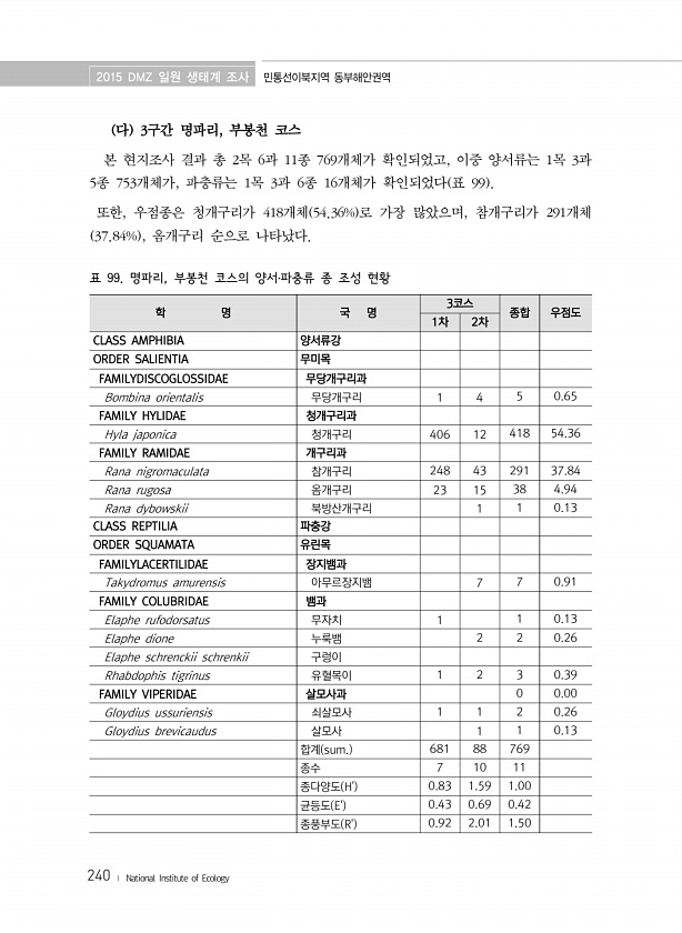 2015 DMZ 일원 생태계 조사 민통선이북지역 동부해안권역 240 ? National Institute of Ecology 다 3구간 명파리, 부봉천 코스 본 현지조사 결과 총 2목 6과 11종 769개체가 확인되었고, 이중 양서류는 1목 3과 5종 753개체가, 파충류는 1목 3과 6종 16개체가 확인되었다 표 99 또한, 우점종은 청개구리가 418개체 54.36% 로 가장 많았으며, 참개구리가 291개체 37.84% , 옴개구리 순으로 나타났다. 학 명 국 명 3코스 종합 우점도 1차 2차 CLASS AMPHIBIA 양서류강 ORDER SALIENTIA 무미목 FAMILYDISCOGLOSSIDAE 무당개구리과 Bombina orientalis 무당개구리 1 4 5 0.65 FAMILY HYLIDAE 청...