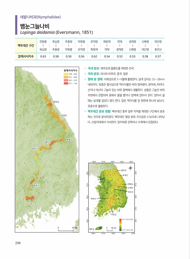 250 ? 국내 분포제주도와 울릉도를 제외한 전국 ? 국외 분포러시아 아무르, 중국, 일본 ? 형태 및 생태이화성으로 5∼9월에 활동한다. 날개 길이는 25∼28mm 내외이다. 유충은 협식성으로 먹이식물은 벼과 참바랭이, 참억세, 띠이다. 산지나 야산의 그늘이 있는 바위 절벽에서 생활한다. 성충은 그늘진 바위 주변에서 관찰되며 꽃에서 꿀을 빨거나 암벽에 앉아서 쉰다. 앉아서 쉴 때는 날개를 접었다 폈다 한다. 알은 먹이식물 잎 뒷면에 하나씩 낳는다. 유충으로 월동한다. ? 백두대간 분포 현황백두대간 중부 일부 지역을 제외한 구간에서 분포 하는 것으로 분석되었다. 백두대간 평균 분포 지수값은 0.56으로 나타났 다. 산림지대에서 서식한다. 양지바른 관목이나 수목에서 관찰된다. 백두대간 구간 천왕봉 | 육십령 ...