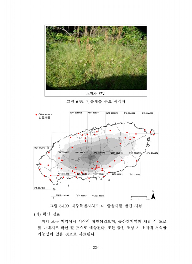 224 소격자 67번 그림 6-99. 방울새풀 주요 서식처 그림 6-100. 제주특별자치도 내 방울새풀 발견 지점 라 확산 경로 거의 모든 지역에서 서식이 확인되었으며, 중산간지역의 개발 시 도로 및 나대지로 확산 될 것으로 예상된다. 또한 공원 조성 시 초지에 서식할 가능성이 있을 것으로사료된다.