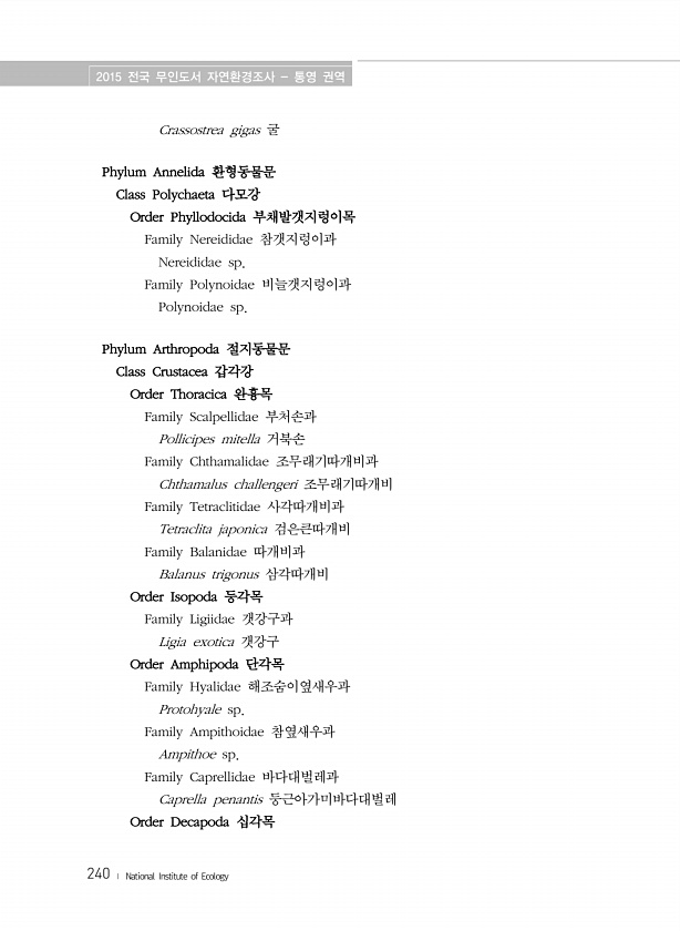 2015 전국 무인도서 자연환경조사 통영 권역 240 ? National Institute of Ecology Crassostrea gigas 굴 Phylum Annelida 환형동물문 Class Polychaeta 다모강 Order Phyllodocida 부채발갯지렁이목 Family Nereididae 참갯지렁이과 Nereididae sp. Family Polynoidae 비늘갯지렁이과 Polynoidae sp. Phylum Arthropoda 절지동물문 Class Crustacea 갑각강 Order Thoracica 완흉목 Family Scalpellidae 부처손과 Pollicipes mitella 거북손 Family Chthamalidae 조무래기따개비과 Chthamalus challengeri 조무...
