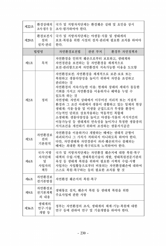 제22조 환경상태의 조사·평가 등 국가 및 지방자치단체는 환경훼손 실태 및 요인을 상시 조사·평가하여야 한다. 제29조 환경보전시 설의 설치·관리 국가 및 지방자치단체는 야생동·식물 및 생태게의 보호·복원을 위한 시설의 설치·관리에 필요한 조치를 하여야 한다. 법령명 자연환경보전법 관련 부처 환경부 자연정책과 제1조 목적 자연환경을 인위적 훼손으로부터 보호하고, 생태계와 자연경관을 보전하는 등 자연환경을 체계적으로 보전·관리함으로써 자연환경의 지속가능한 이용을 도모함 제2조 정의 자연환경보전자연환경을 체계적으로 보존·보호 또는 복원하고 생물다양성을 높이기 위하여 자연을 조성하고 관리하는 것 자연환경의 지속가능한 이용현재와 장래의 세대가 동등한 기회를 가지고 자연환경을 이용하거나 혜택을 누릴 수 있도록 하는 ...
