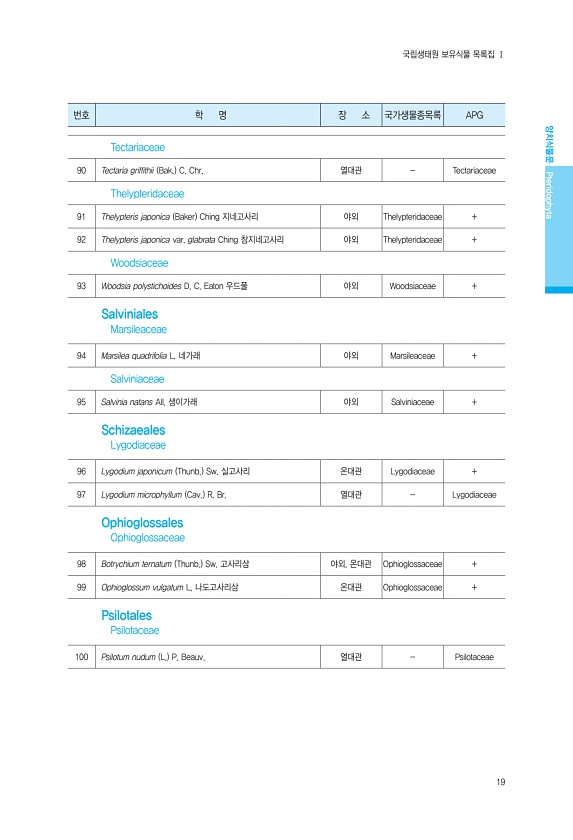 19 번호 학 명 장 소 국가생물종목록 APG 양치식물문 Pteridophyta 국립생태원 보유식물 목록집 Ⅰ Tectariaceae 90 Tectaria griffithii Bak. C. Chr. 열대관 Tectariaceae Thelypteridaceae 91 Thelypteris japonica Baker Ching 지네고사리 야외 Thelypteridaceae + 92 Thelypteris japonica var. glabrata Ching 참지네고사리 야외 Thelypteridaceae + Woodsiaceae 93 Woodsia polystichoides D. C. Eaton 우드풀 야외 Woodsiaceae + Salviniales Marsileaceae 94 Marsilea quadrifoli...