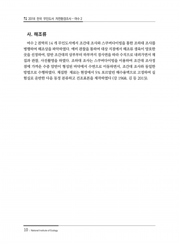 2018 전국 무인도서 자연환경조사 여수 2 10 ? National Institute of Ecology 여수 2 권역의 14 개 무인도서에서 조간대 조사와 스쿠버다이빙을 통한 조하대 조사를 병행하여 해조상을 파악하였다. 예비 관찰을 통하여 대상 지점에서 해조류 생육이 양호한 곳을 선정하여, 암반 조간대의 상부부터 하부까지 경사면을 따라 수직으로 내려가면서 채 집과 관찰, 사진촬영을 하였다. 조하대 조사는 스쿠버다이빙을 이용하여 조간대 조사정 점에 가까운 수중 암반이 형성된 바닥에서 수면으로 이동하면서, 조간대 조사와 동일한 방법으로 수행하였다. 채집한 재료는 현장에서 5% 포르말린 해수용액으로 고정하여 실 험실로 운반한 다음 동정 분류하고 건조표본을 제작하였다 강 1968, 김 등 2013